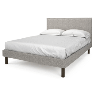 • Cadre de lit en bois légèrement rembourré, d'une hauteur de 10 pouces, revêtu d'un tissu gris clair